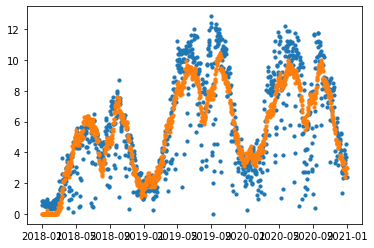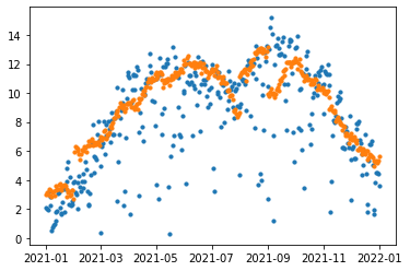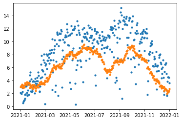 t['se'] = (t.yhat - t.y)**2plt.scatter(t['ds'], t['y'], s=10)