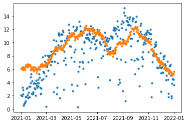 plt.scatter(t['ds'], t['yhat'], s=10)
